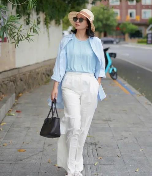 朱丹引领春季新风尚:蓝色衬衫配白色阔腿裤,时尚减龄又洋气